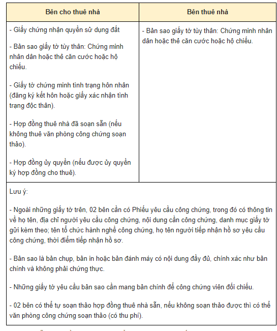 Căn cứ Điều 40 và Điều 41 Luật Công chứng 2014, khi công chứng hợp đồng thuê nhà ở phải chuẩn bị các giấy tờ như sau: