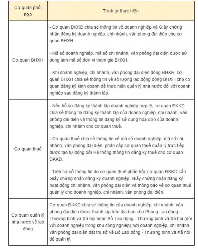 Theo khoản 1 Điều 3 Nghị định 122/2020/NĐ-CP, từ ngày 15/10/2020, cơ quan ĐKKD sẽ là cơ quan đầu mối tiếp nhận hồ sơ và trả kết quả giải quyết thủ tục đăng ký thành lập doanh nghiệp, đăng ký hoạt động chi nhánh, văn phòng đại diện, khai trình việc sử dụng lao động, cấp mã số đơn vị tham gia BHXH, đăng ký sử dụng hóa đơn của doanh nghiệp, cụ thể: