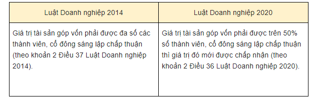 Trường hợp tổ chức thẩm định giá định giá thì giá trị tài sản góp vốn phải được các cổ đông, thành viên chấp thuận. Luật Doanh nghiệp 2020 quy định cụ thể về tỷ lệ chấp thuận so với Luật Doanh nghiệp 2014 như sau: