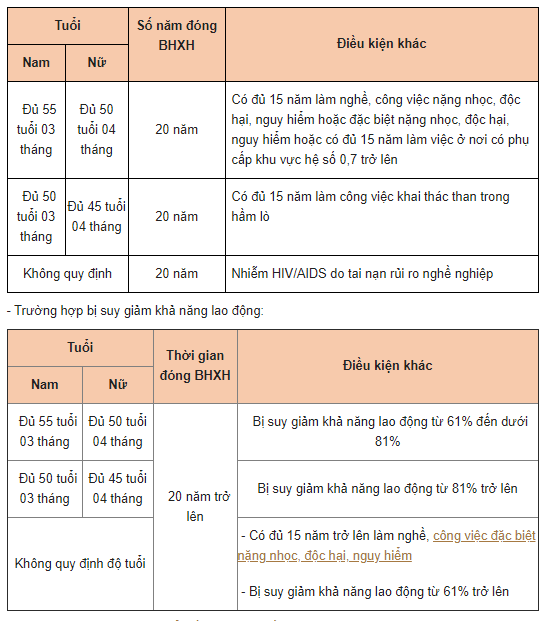 - Lao động nam nghỉ hưu năm 2021 là 19 năm, từ năm 2022 trở đi là 20 năm.